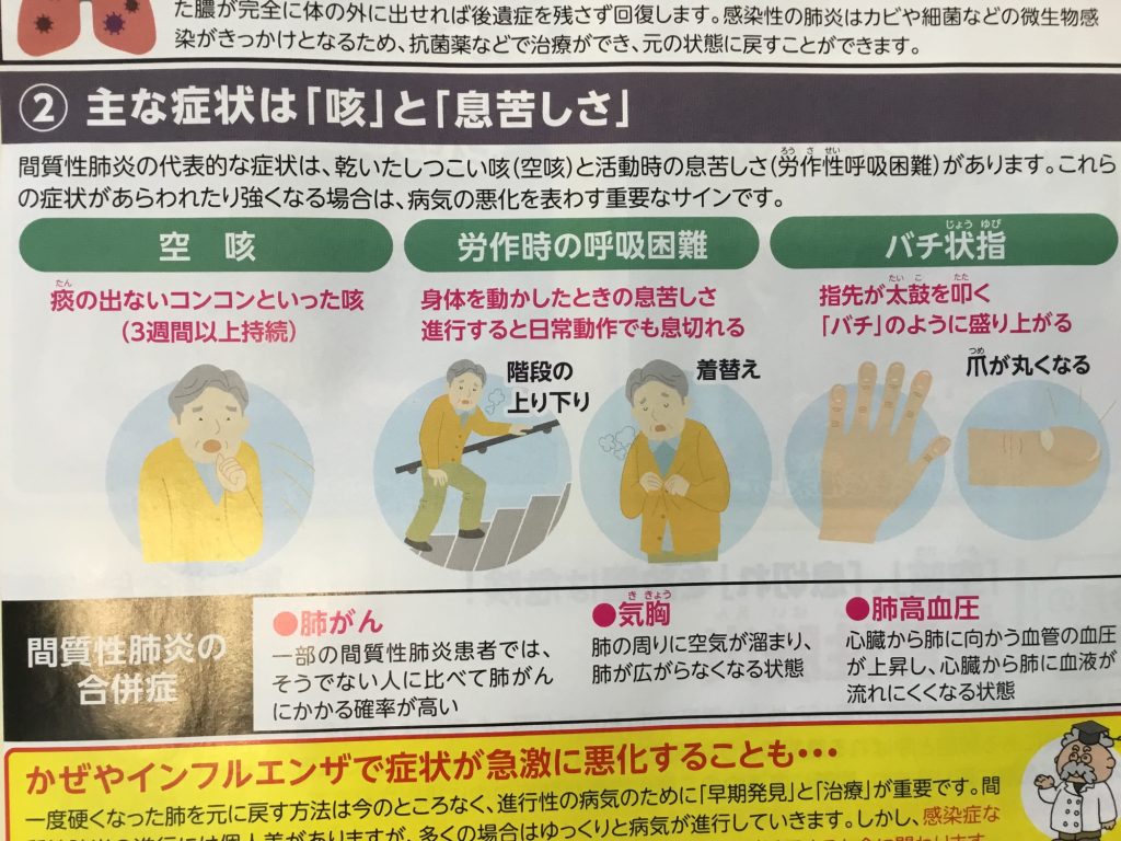 [間質性肺炎]は肺組織が硬くなり酸素を取り込みなる病気で呼吸困難になったり命に関わることにもなります。